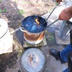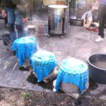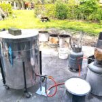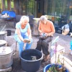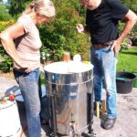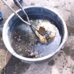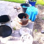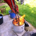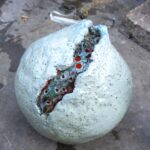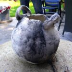 Een paar keer per jaar, in de zomer, stook ik RAKU samen met een bevriend keramiste. Het is een geweldig, intens en direct proces, waarbij vuur, rook en toeval een grote rol spelen. het proces gebeurt in de openlucht, in een oven. Na het stoken worden de werken gloeiend heet uit de oven gehaald en aan de open lucht en het koele water toevertrouwd. In dit moment van overgang — van hitte naar afkoeling — ontstaan onvoorspelbare sporen, craquelé en verkleuringen. Iedere keer is het weer een fantastisch gebeuren. Verwondering, dankbaarheid en overweldiging spelen hier een rol.